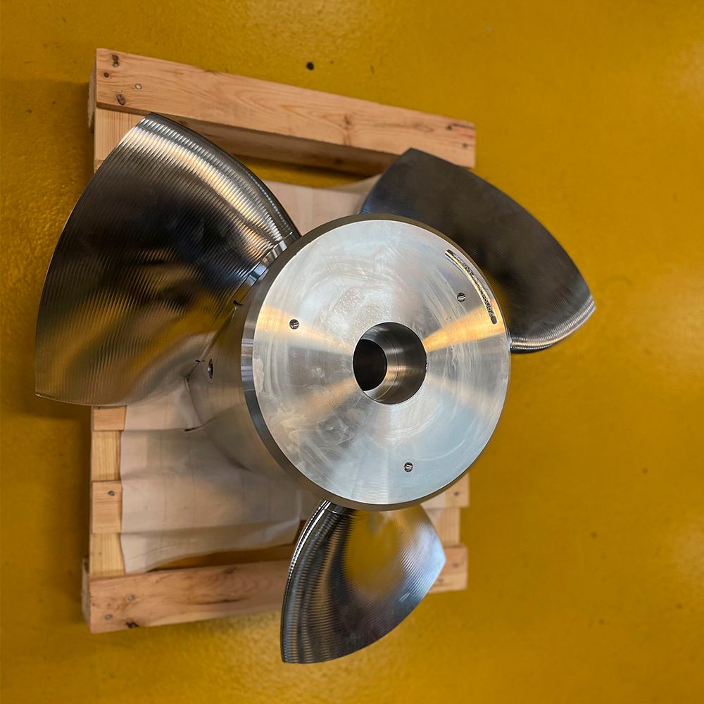 Nu har vi netop sendt den første propel med en diameter på hele 750 mm ud i verden. Den er så stor, at hvert propelblad er fræset for sig selv og til sidst er propellen samlet af de fire dele.