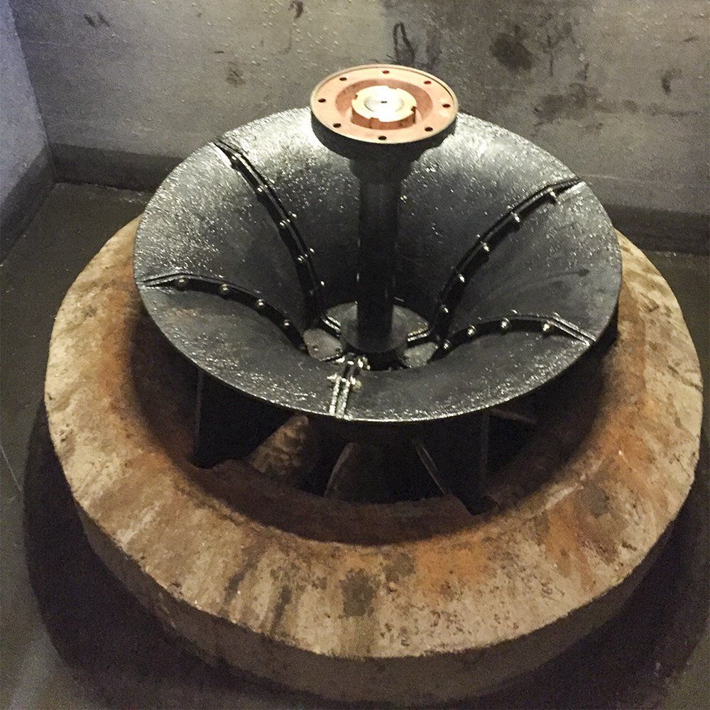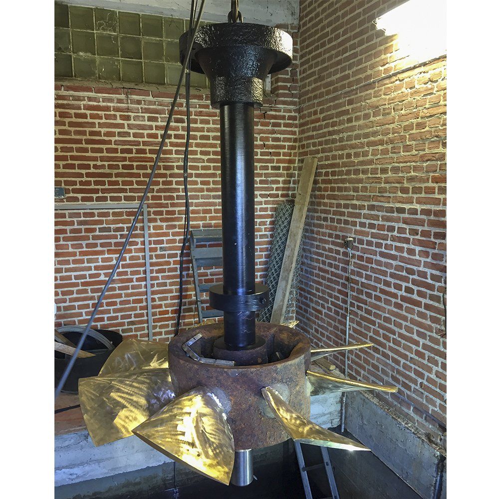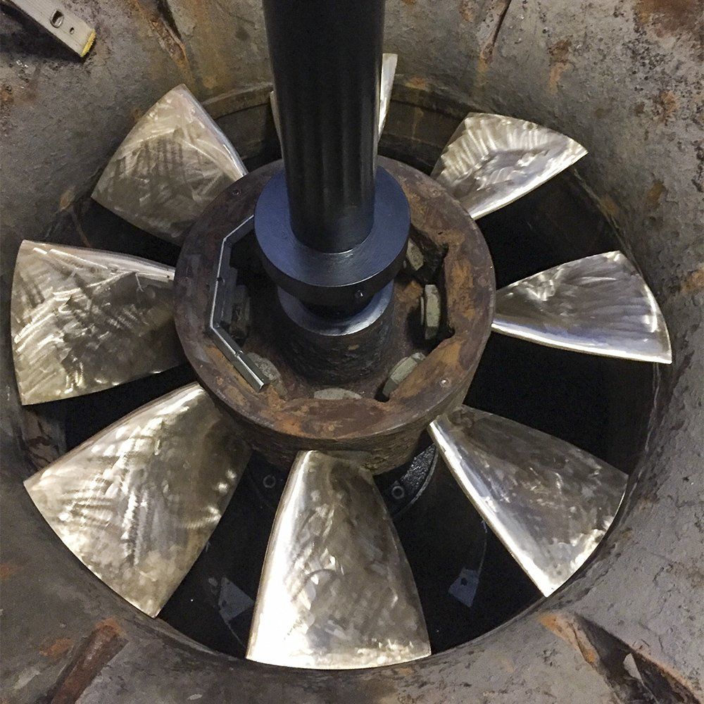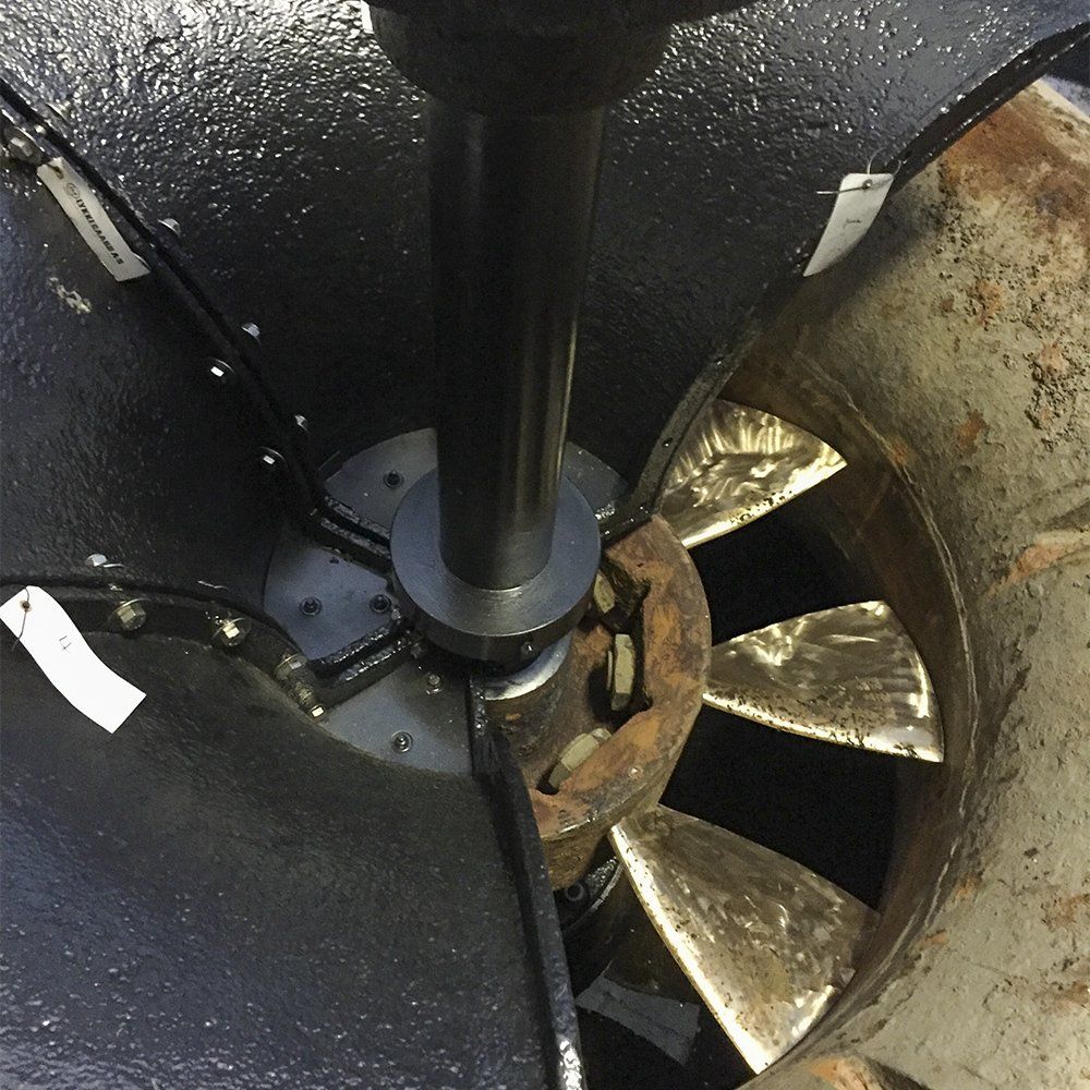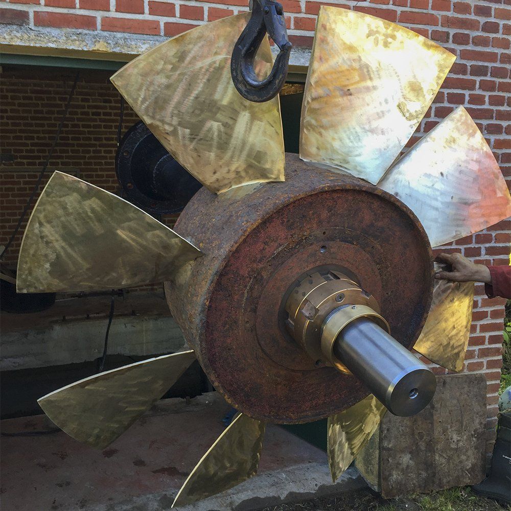 I foråret gik den ene af de to helt store pumper, som dræner Århus Nord i stykker. Lykkegaard A/S har serviceret pumperne i mere end 30 år og fik derfor naturligt også opgaven med at reparere pumpen. Der var brug for en gennem-restaurering. For ud over den aksel, som var gået i stykker og var anledningen til reparationen, var propelbladene efterhånden blevet slidt så meget, at de var for korte og skulle forlænges, ledebladene, som leder vandet ned til propellen, var alle medtagede – og de fleste havde rust-huller.