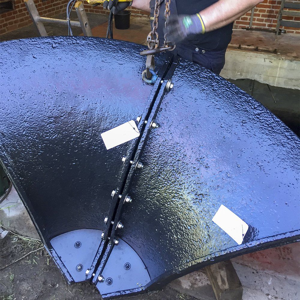 Kontraklapperne som sikrer, at vandet ikke løber tilbage, når pumperne slukkes, var af træ, som var udtørret og rådnet. Så de blev helt skiftet og Lykkegaard har bygget nye, som passer til præcis dét pumpehus.