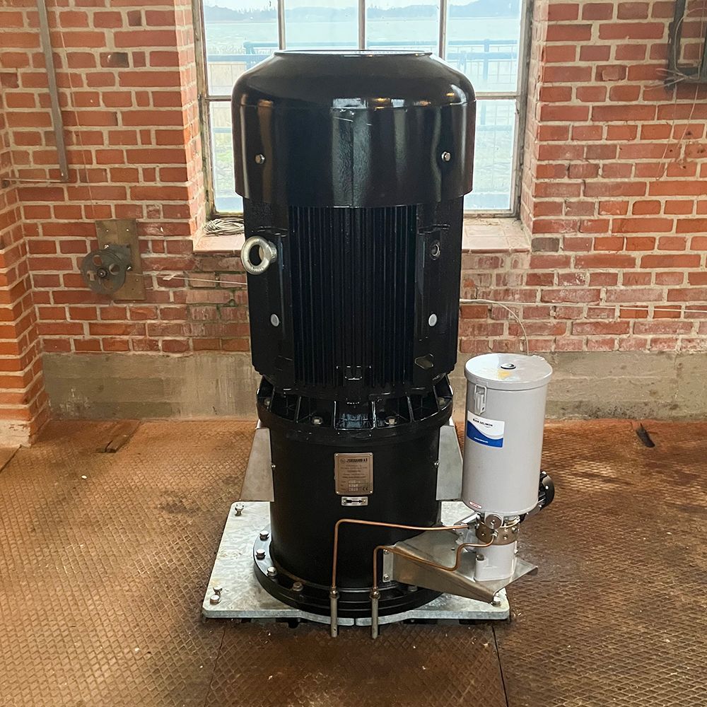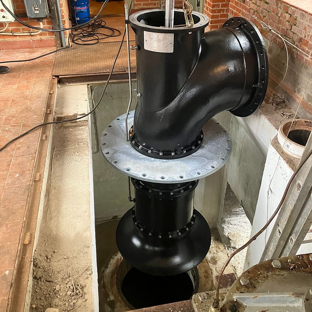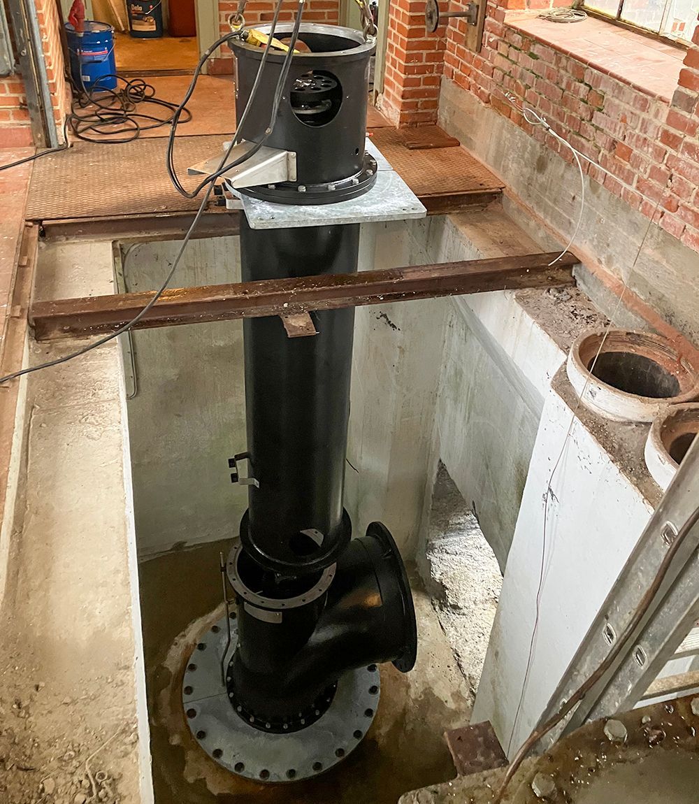 Den nye pumpe ser godt nok ud på samme måde som den forrige, så den passer ind i pumpehuset, men den er dimensioneret med en kraftigere motor og til en højere løftehøjde, så den kan pumpe mere vand op og ud i fjorden.