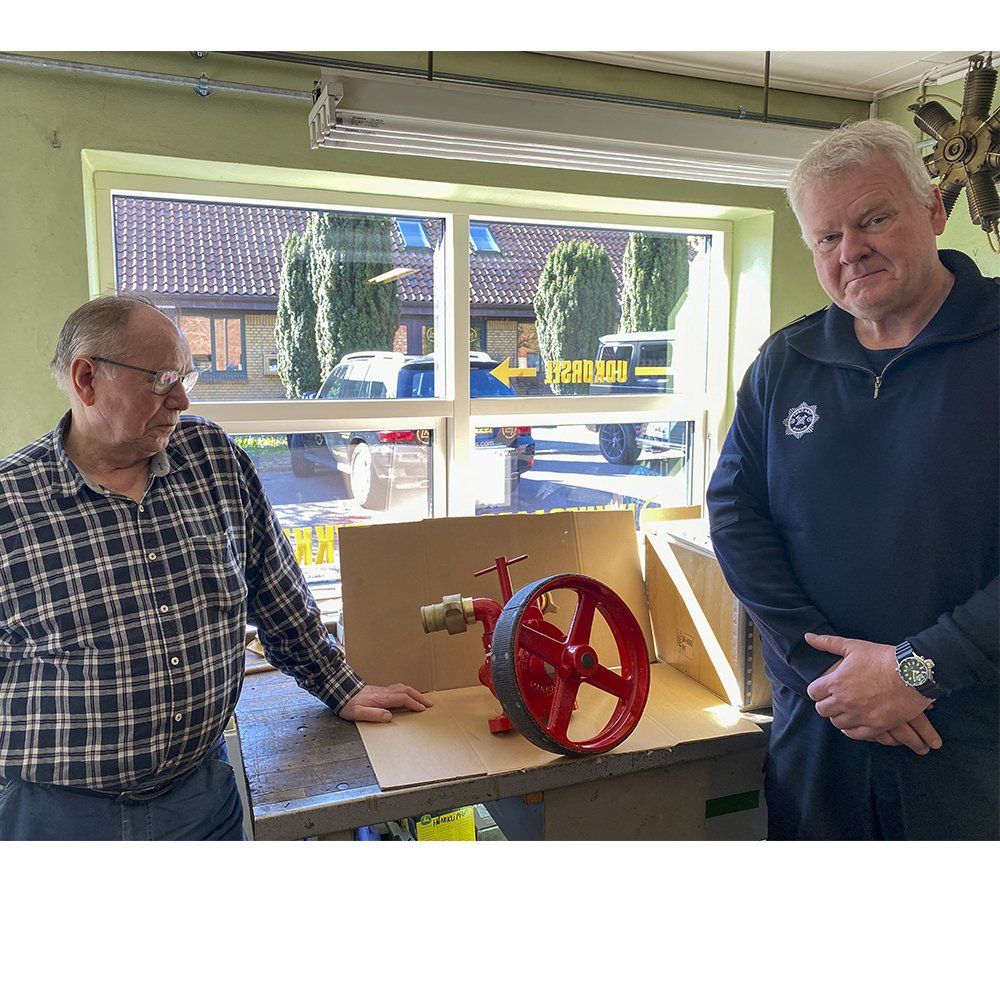 Det har vi fået hos Lykkegaard. Fredericia Brandvæsens Seniorforening har fået en af de første originale Ellehammer brandpumper, som blev udviklet i starten af 1900-tallet, så brandmændene ikke længere selv behøvede bruge deres kræfter på at pumpe vandet. De kunne i stedet bruge kraften fra bilen til at trække pumpen og dermed vandet gennem sprøjten.